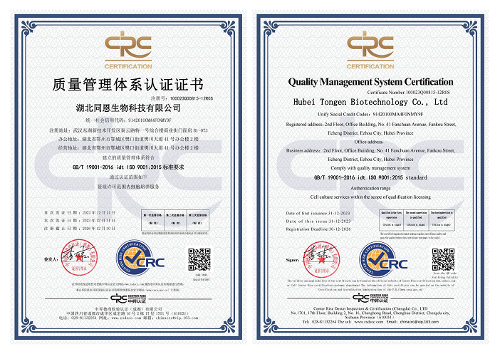 获得ISO9001细胞培养质量管理认证